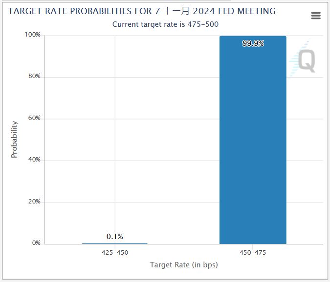 根據芝商所的FedWatch工具,市場預測11月降息一碼(0.25%)的機率高達99.9%(目標利率區間4.50%-4.75%),降息兩碼的機率則僅為0.1%。