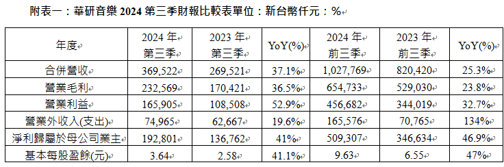 綜觀華研音樂2024年前三季,合併營收淨額10.3億元,較去年同期8.2億元增加25.3%;營業毛利6.5億元,較去年同期5.3億元增加23.8%;營業利益4.6億元,較去年同期3.4億元增加32.7%;淨利歸屬於母公司業主5.1億元;2024年前三季基本每股盈餘(EPS)9.63元,較去年同期6.55元增加47%。