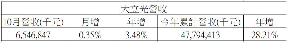 光學鏡頭龍頭廠大立光(3008)昨(5)日公告10月營收65.47億元,與上月近乎持平,年增4%;前10月累計營收477.94億元,年增28%。最新EPS為33.7元,季增-26.4%,近四季EPS為161.29元。