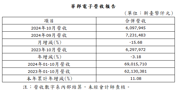 華邦電子(2344)股份有限公司今日公佈自行結算的2024年10月份營收報告。華邦含新唐科技等子公司,10月份合併營收為新臺幣60.98億元,較上個月減少15.68%,較去年同期減少3.18%。累計2024年01至10月合併營收為新臺幣690.16億元,較去年同期增加11.08%。