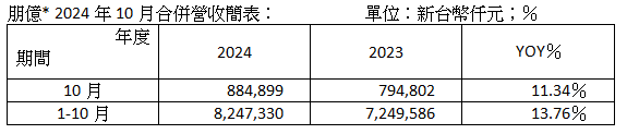 半導體暨面板製程供應系統大廠朋億股份有限公司(6613)於今日公布2024年10月合併營收8.85億元,年增11.34%,續創歷年同期新高。累計2024年1至10月合併營收82.47億元,年增13.76%,同步改寫歷年同期新高記錄。