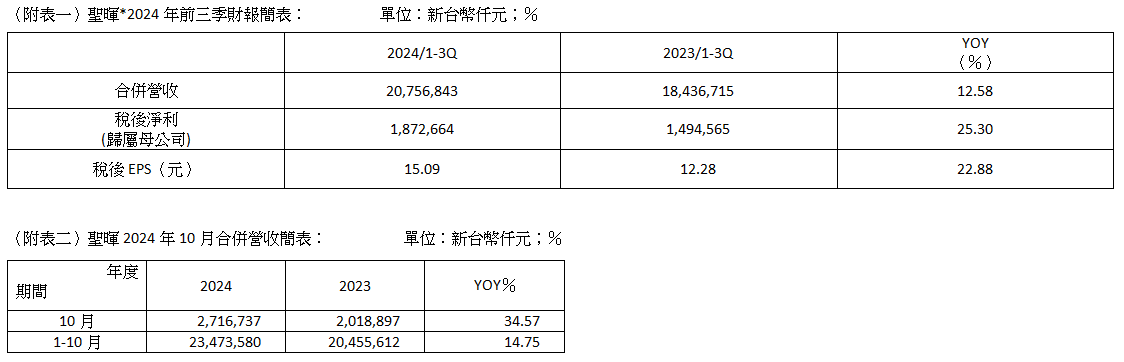 聖暉*前三季EPS達15.09元 創歷年同期新高 24H1配發現金股利5元 10月營收年增35% 續創歷年同期新高