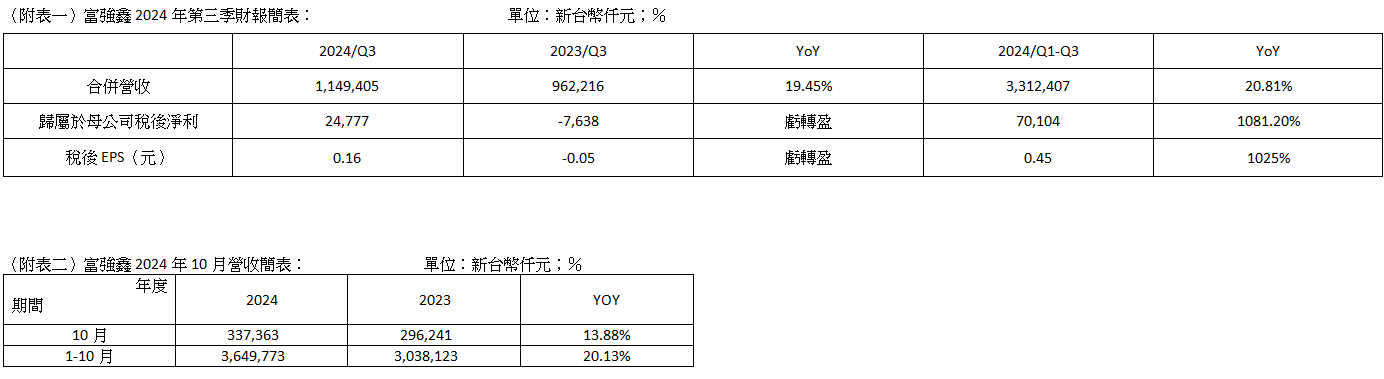富強鑫同步公布2024年10月合併營收為3.37億元,雖受到中國十一長假、工作天數較少影響,但單月營收較去年同期營收2.96億元增加13.88%;累計2024年1至10月營收達36.5億元,較去年同期30.38億元增加20.13%。主要是受惠於越南市場包括汽車零組件、運動等產業客戶對於多色機、全電機的需求增溫,尤其是全電機方面,今年10月的出貨業績大躍進,占整體營收比重首度來到超過10%,凸顯富強鑫在塑膠射出成形機的超前整合機電技術的優異表現。