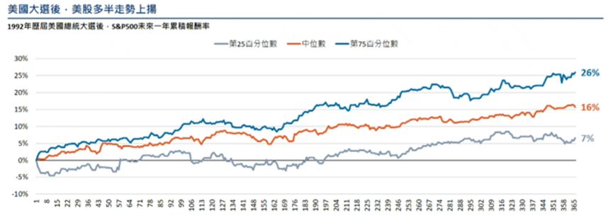 美國總統大選塵埃落定,美股四大指數攜手上演慶祝行情,其實從1992年以來的歷屆美國總統大選,可以看出大選過後,在不確定性消除下,股市上攻壓力獲得緩解,S&P 500指數未來一年累積報酬率少則7%,多則26%,平均可達16%水準,顯示大選後一年美股上漲機率高(圖)。凱基投信表示,在經濟有望軟著陸、降息循環啟動、AI行情持續帶動下,大選後股市可望重回上升軌道,惟目前個別產業利多尚待新任總統確認政策實施方向;透過全產業布局,可一次網羅所有產業機會。