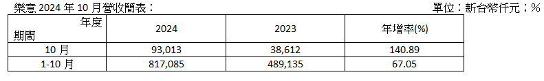 樂意傳播股份有限公司(7584)今日公告10月份合併營收為新台幣9,301萬元,較去年同期成長140.89%,累計1-10月營收8.17億元,較去年同期成長67.05%,續創歷史新高。
