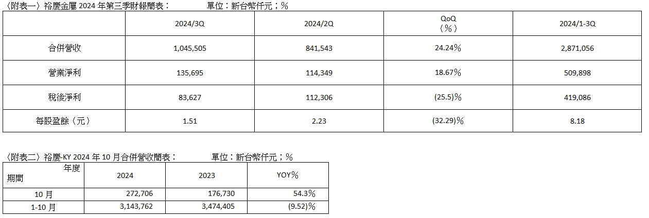 裕慶金屬股份有限公司(6957)於今日公布2024年第三季合併營收為10.5億元,季增24.24%,營業利益1.4億元,季增18.67%,由於受到台幣及人民幣兌美元升值產生業外匯兌損失影響,稅後淨利0.84億元,每股稅後盈餘(EPS)1.51元,若排除業外匯兌損失3,776萬元,則第三季每股稅後盈餘(EPS)為2.20元,仍與今年第二季獲利相當。累計2024年前三季合併營收28.7億元,稅後淨利4.19億元,每股稅後盈餘(EPS)8.18元。
