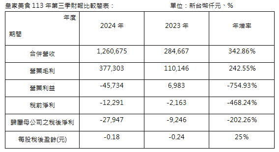 台鋼集團旗下餐飲企業皇家國際美食股份有限公司(4419)6日召開董事會,會中通過第三季合併財務報告書。第三季合併營收為新台幣6.34億元,較去年同期成長618.17%,受惠於旗下暑假旺季及各式節慶活動,使得本季合併營收依舊表現優異。第三季歸屬母公司之稅後淨利為1,123仟元,較去年同期增加170.06%,主要來自於母公司皇家美食本季將彰化拓農路廠處分,以活絡公司資產之使用。累計⾄本期⽌營業收入為12.61億元,較去年同期成長342.86%,累計⾄本期⽌歸屬母公司之稅後淨利為-2,795萬元、年減202.26%,EPS(每股稅後盈餘)為-0.18元。