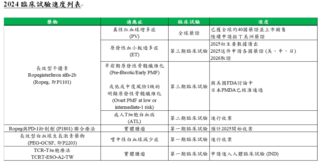 Ropeg以外的新藥臨床試驗進度亦進展順利,藥華藥旗下長效型顆粒性白血球生成素(PEG-GCSF, 研發代號P2203)在台灣進行的第一期臨床試驗已開始收案,PD-1抑制劑P1801接續Ropeg,兩者搭配用於治療末期腫瘤患者之第一期臨床試驗也已獲TFDA同意執行,預計2025年初開始收案。