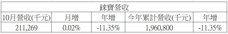 10月最新營收為2.1億元,月增0.02%,連續4個月成長,年增-11.35%,連續6個月衰退;今年1到10月累計營收為19.6億元,年增-11.35%。最新EPS為0.36元,季增56.52%,連續4季成長,創9季新高,近四季EPS為0.12元。
