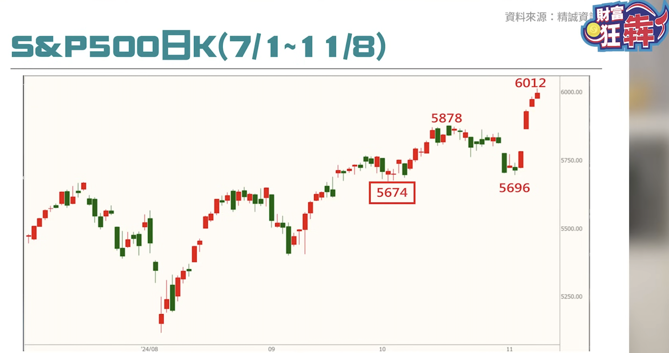 李其展提醒,股市的續好與短線漲幅過頭需要分開看待。投資人應時時關注兩個重點:「是否已漲過頭」,以及「走勢中短線支撐位置」。以 S&P 500 指數為例,目前仍處於創歷史新高的多頭格局中。回檔位置可觀察先前盤整低點 5674 可以作為短線支撐點。在川普當選前,指數一度回測至 5696,守住後再次上漲,確認了支撐位置。