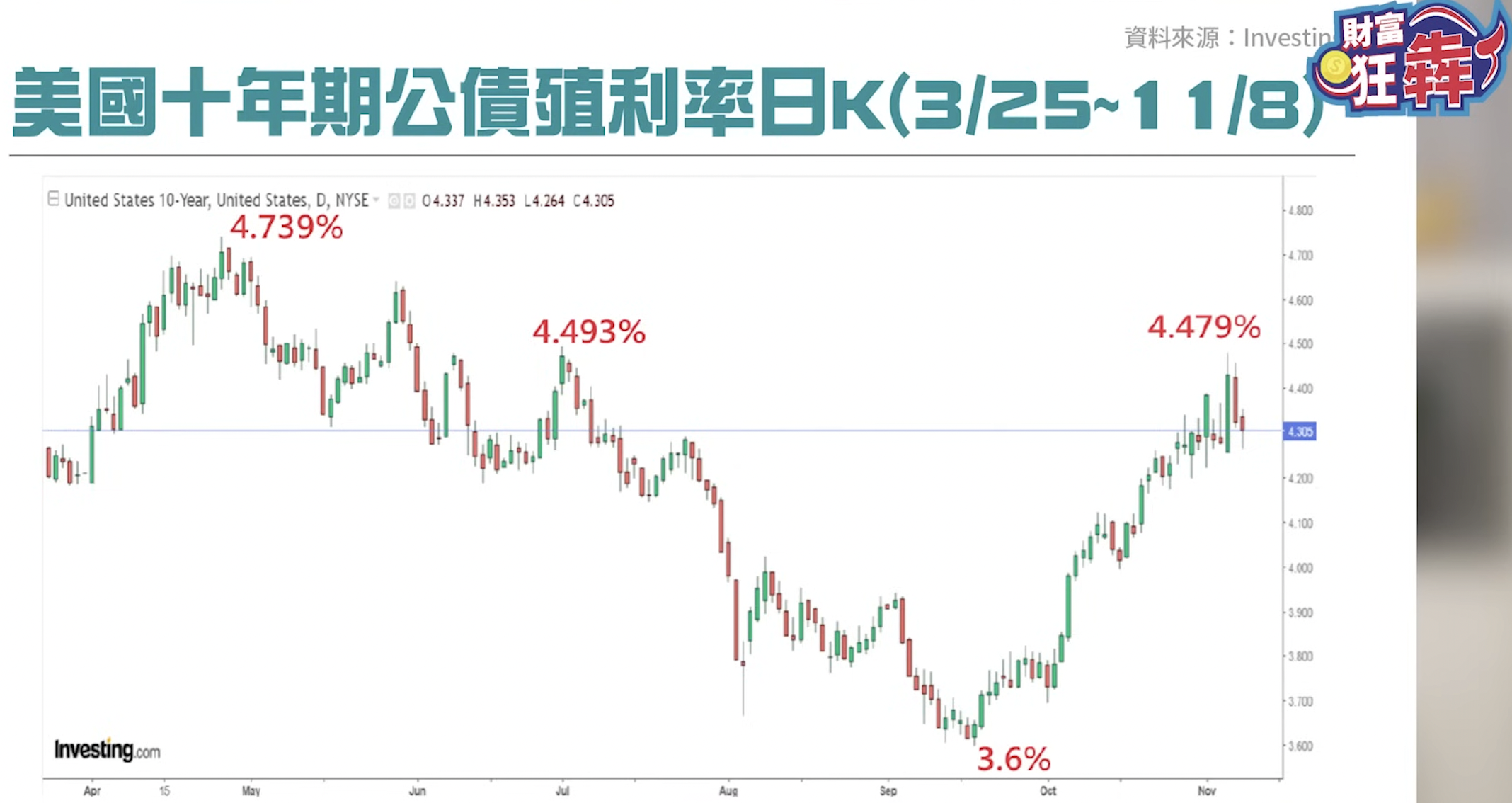 因此,投資人可以將 4.5% 視為關鍵關卡,若突破新高,需留意進一步挑戰 4.739% 的可能性;若未突破,則可能逐步進入築底階段。李其展分析,長天期公債要大漲,最簡單的方法就是股市崩盤、經濟衰退,馬上就會採取量化寬鬆的救市措施,但如今並沒有這樣的條件。