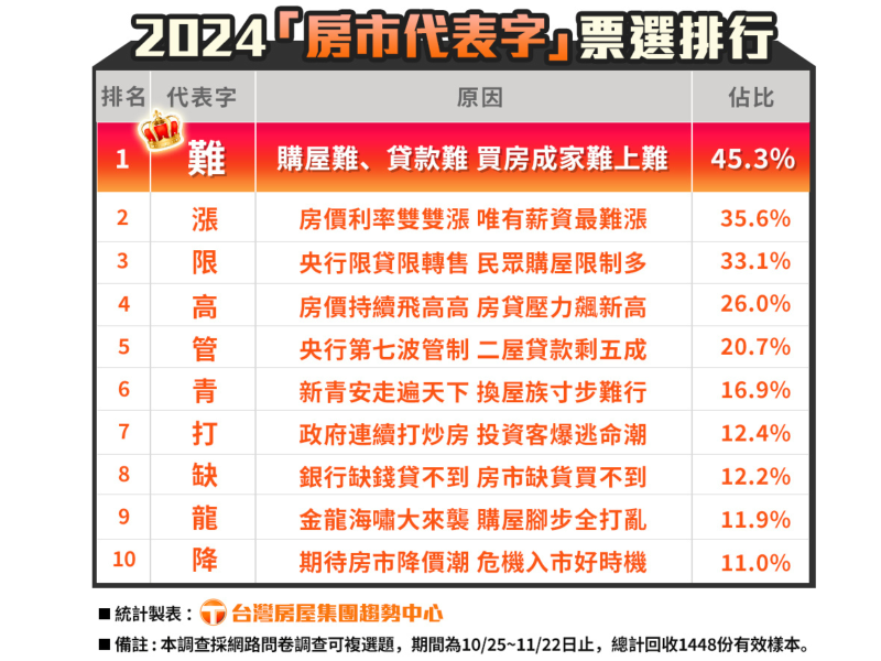 台灣房屋房市代表字票選由台灣房屋經紀人員進行首輪票選,選出各10組代表字與房市焦點新聞,再由民眾進行第二輪網路投票,選出十大「2024年台灣房市代表字及房市新聞」,統計時間自10月25日至11月22日,本次調查共回收1,448份樣本。