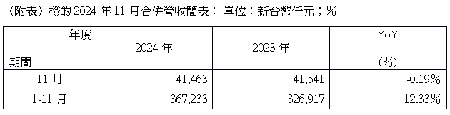 胎壓偵測器(TPMS)大廠橙的電子股份有限公司(4554)今日公布2024年11月合併營收達新台幣0.41億元,較上月成長9.04%。累計2024年1至11月合併營收達3.67億元,較去年同期成長12.33%。