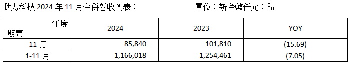 動力科技股份有限公司(6591) 公布2024年11月合併營收85,840仟元,由於受客戶新舊產品交替影響,11月營收較上月減少7.1%。累計2024年1至11月合併營收11.66億元,年減7.05%。