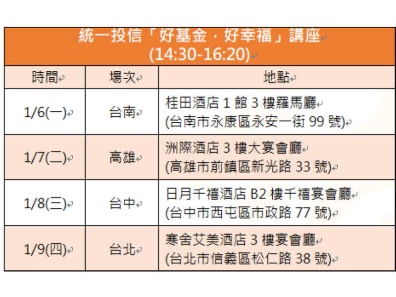 2024年全球股市呈現多頭走勢,樂觀的投資氣氛讓許多投資人獲益良多。展望2025年,投資人想問,股市多頭行情是否可以延續?統一投信總經理董永寬將攜手金獎投研團隊,舉辦「好基金,好幸福」系列講座,與投資人分享全球資產配置策略、創新科技潛力及台股投資機會。本次講座共有四場,分別為1/6台南、1/7高雄、1/8台中及1/9台北,目前已開始報名,名額有限,有意參與的投資人,趕快透過統一投信官網報名。