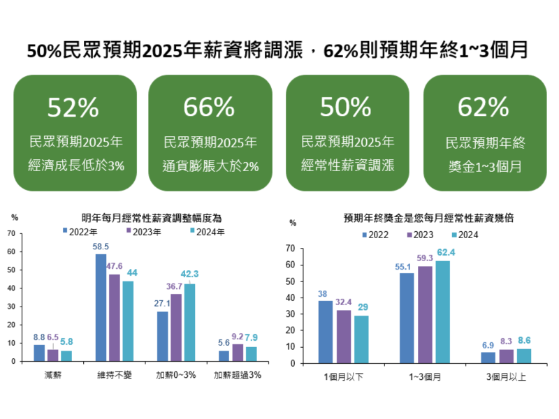 調查結果,52%民眾預期2025年經濟成長率低於3%,66%民眾預期通膨高於2%:主計總處11月預估台灣2025年經濟成長率3.29%,通貨膨脹率1.93%。