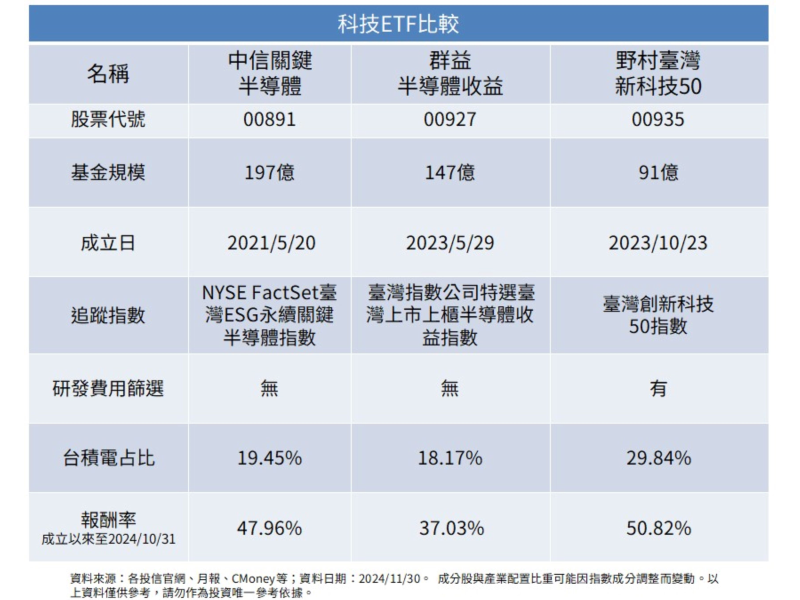 以下比較科技股的相關ETF,從追蹤指數來看,可知中信關鍵半導體(00891)、群益半導體收益(00927)以半導體產業為主軸,再綜合其他指標來進行篩選。其中,00935追蹤指數奠基於FactSet RBICS Level 6總計的73個次產業,再綜合考量財務指標、成長指標(研發費用佔營收比重)、動能指標等,聚焦50檔持續投入研發創新的公司。