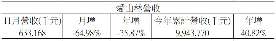 愛山林11月營收為6.3億元,月減64.98%,年減35.87%;累計今年前11月營收為99.4億元,年增40.82%。最新每股盈餘(EPS)為0.73元,季減44.7%,已連續三季下滑,近四季EPS為3.82元。