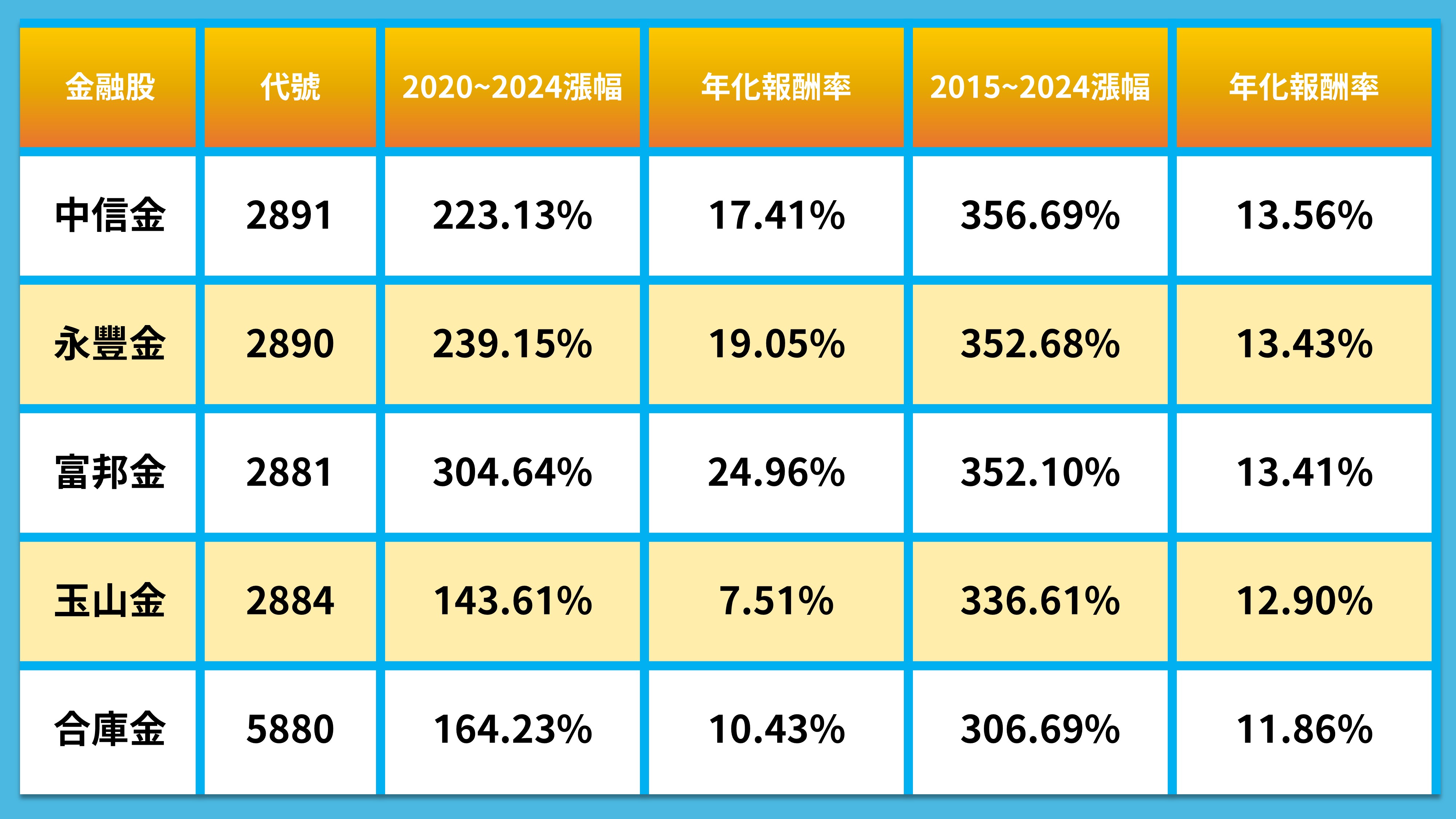 - 長期增值性:從十年來的數據顯示,金融股不僅能抵抗通膨,還能提供資本增值,填補債券投資的劣勢。