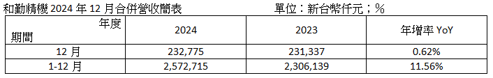 高端精密沖壓大廠和勤精機(1586)於今日公告2024年12月份合併營收2.33億元,較上月增加3.21%、並較上年同期成長0.62%;累計2024年全年合併營收25.73億元,年增11.56%。硬碟零件、車用零件出貨穩定增加,2024年營收達到雙位數成長目標,今年在硬碟零件持穩、車用零件新品陸續量產的貢獻下,預期全年營收將保持向上增長。