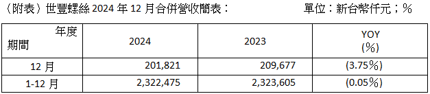 螺絲大廠世豐螺絲股份有限公司〈2065〉於今日公布2024年12月合併營收達2.02億元,較上個月成長14.50%表現。累計2024年全年營收達23.22億元,較去年同期微幅減少0.05%。