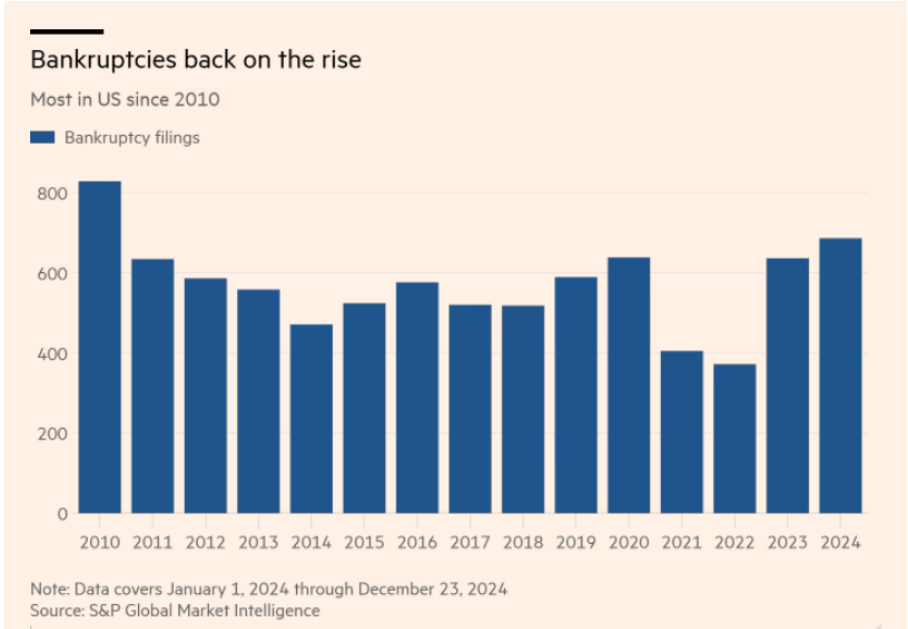 根據標準普爾全球市場情報(S&P Global Market Intelligence)的數據顯示,2024年至少有686家美國企業申請破產,比2023年增長約8%,是自2010年(828家)最多的一年。