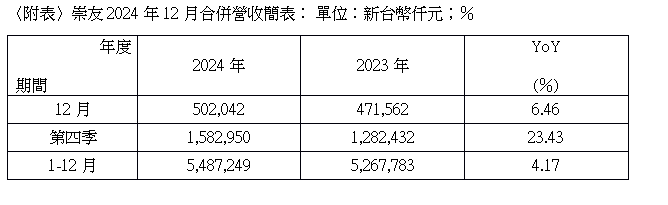 崇友實業股份有限公司(4506)今日公佈2024年12月合併營收達5.02億元,受惠新梯、汰舊換新訂單出貨完工認列進度保持暢旺,以及維修保養業務服務台數穩定增加,挹注12月營收年增6.46%,進一步創造2024年第四季合併營收達15.83億元,較前一年度同期成長23.43%,改寫歷年單季新高之亮眼佳績。累計2024年全年合併營收達54.87億元,年增4.17%,登歷年新高水準。
