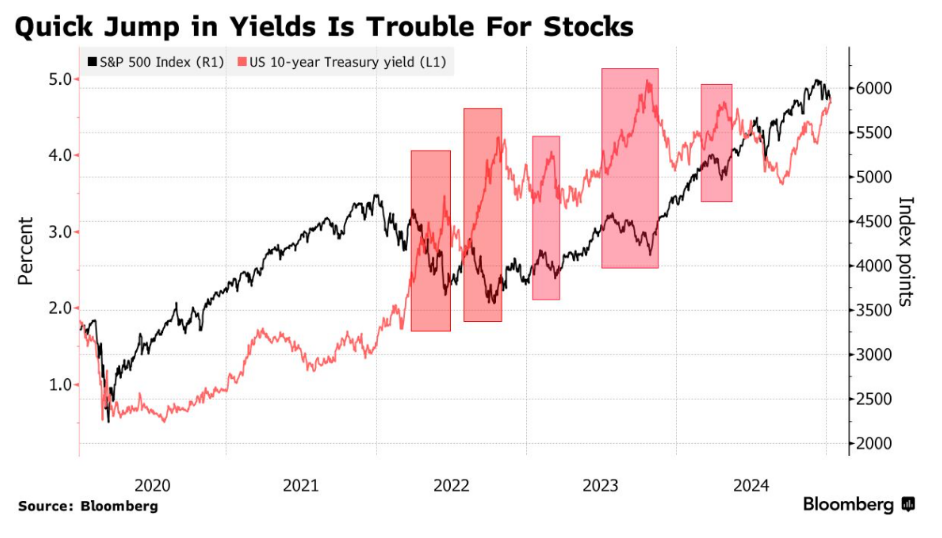 交易員們正在關注對政策敏感的10年期美債殖利率,該殖利率處於2023年10月以來的最高點,而且正在迅速接近5%,他們擔心這一水平可能會引發股市回調。該收益率上一次短暫突破這一門檻是在2023年10月,在此之前則要追溯到2007年7月。