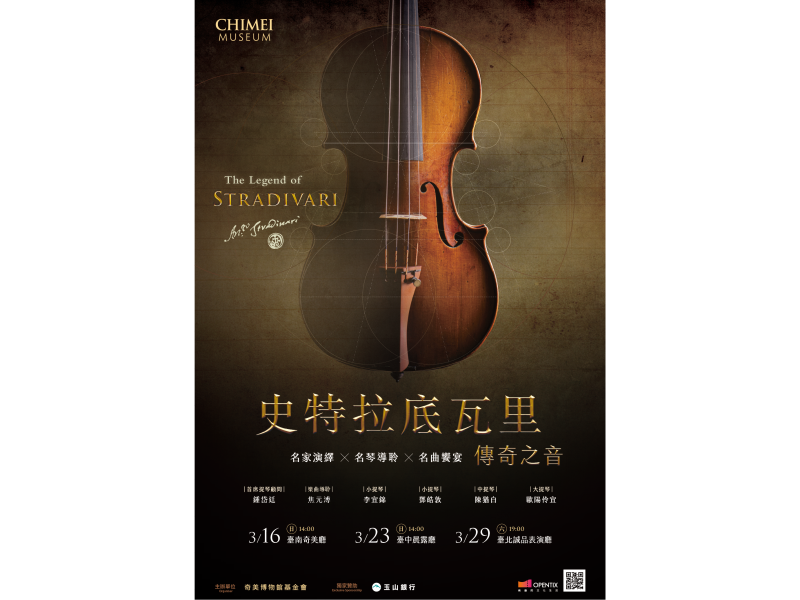 【史特拉底瓦里.傳奇之音】奇美提琴音樂饗宴將於3/16在臺南奇美博物館奇美廳、3/23臺中丰二三晨露廳、3/29臺北誠品表演廳演出。這也是奇美音樂會首度移師臺中,希望讓中部樂迷也能親炙名琴魅力。今起(1/13)開放售票,票價2,800、3,300、3,800元,同步推出早鳥購票75折優惠至2/28止。購票請洽OPENTIX兩廳院文化生活,詳情請上奇美博物館官網:www.chimeimuseum.org。