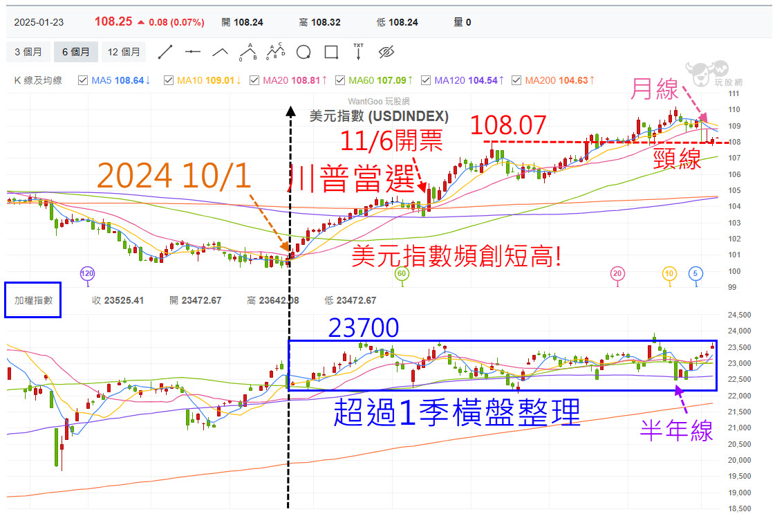 不妨觀察美元指數走勢,是撐在頸線108.07? 還是跌破頸線108.07?