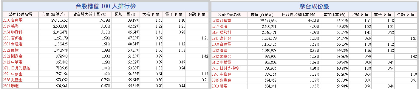 而摩台成分股與加權指數權值排行,累加比重過半的權值股,內容完全一樣!