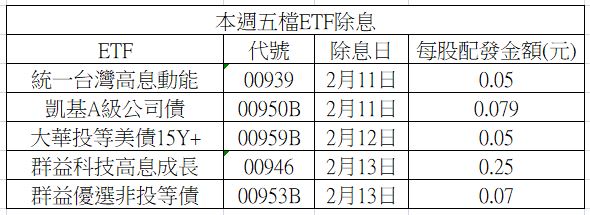 本週共有五檔ETF進行除息,包括群益優選非投等債(00953B)、凱基A級公司債(00950B)、大華投等美債15Y+(00959B)、統一台灣高息動能(00939)與群益科技高息成長(00946)。