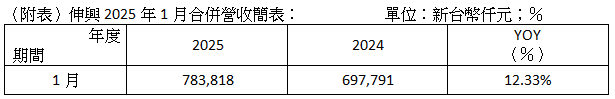 伸興工業股份有限公司(1558)今日公告2025年1月合併營收達7.84億元,雖受農曆春節假期影響,但因上月船期調整因素,使得部分機種遞延至本月出貨,貢獻伸興1月營收繳出較上月6.28億元成長24.72%,較去年同期6.98億元成長12.33%雙佳績,且連續4月單月營收保持年增率正成長,顯示市場對公司產品的長期需求仍具韌性。