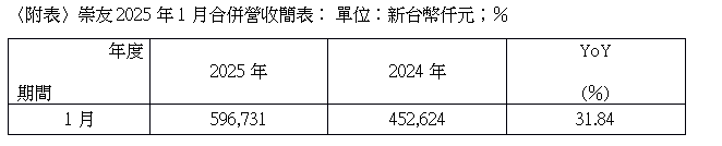 崇友實業股份有限公司(4506)今日公佈2025年1月合併營收達5.97億元,受惠新梯及汰舊換新業務訂單出貨完工認列暢旺,不畏農曆年節工作天數減少影響,帶動1月營收年增31.84%,並創歷年同期新高。