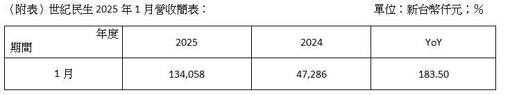 世紀民生科技股份有限公司(5314) 公布2025年1月合併營收1.34億元,月增3.71%,年增183.50%,再度刷新單月營收新高紀錄,顯現世紀民生積極轉型AI智能大健康產業的佈局成果,並為公司營運奠定穩健成長的基礎。