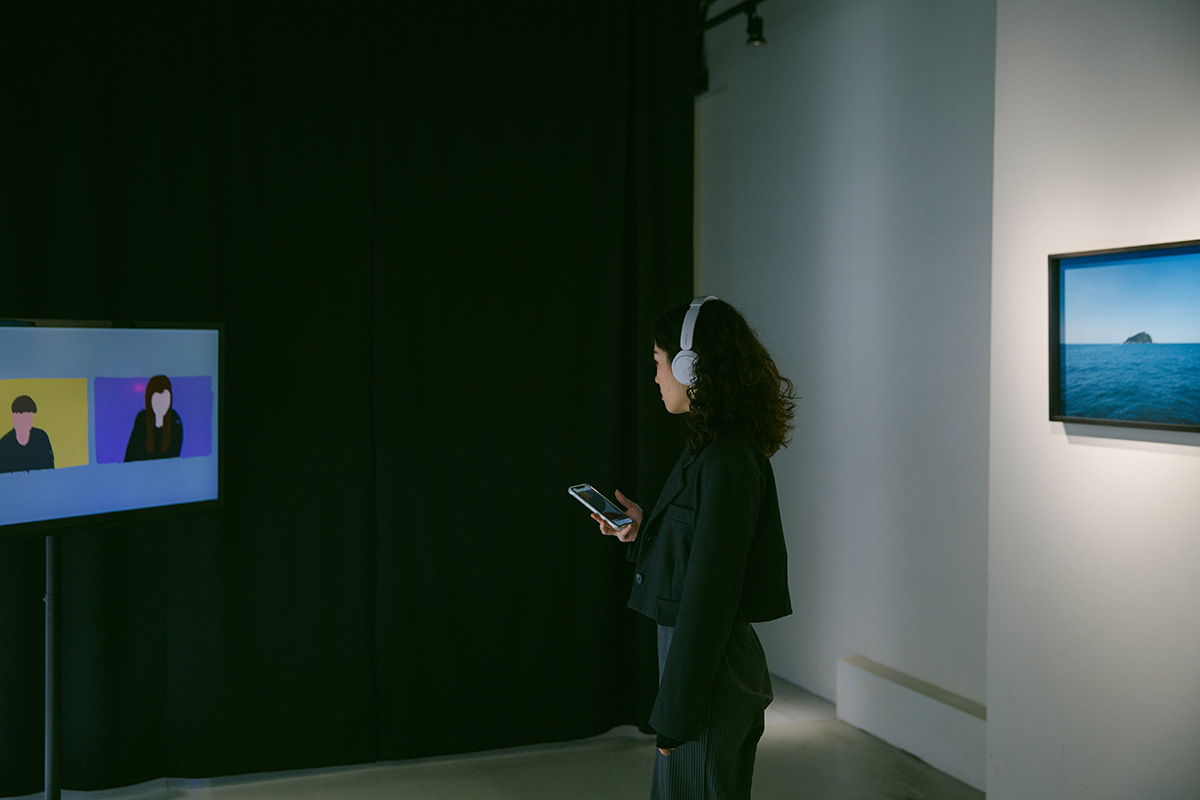 孤身一人走在展間,耳機裡的旁白,指示著你穿梭在畫廊、酒吧、臥房和公車站等不同場景之中,握在掌心的手機則頻繁跳出陌生人傳來的訊息,只是訊息一來一回,開始有些異狀,到底一切是從哪裡開始變化呢⋯⋯