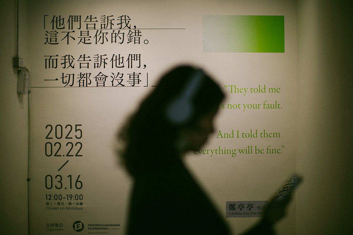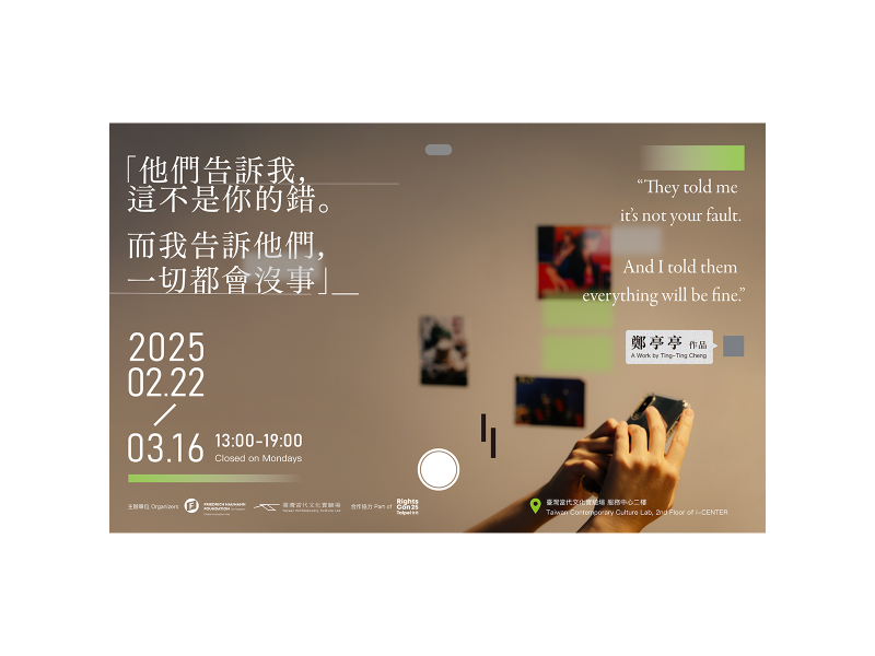 「他們告訴我,這不是你的錯。而我告訴他們,一切都會沒事」一展由德國弗里德里希諾曼自由基金會在台辦事處(FNF Global Innovation Hub,以下稱FNF基金會)發起,邀請藝術家鄭亭亭深入數位性別暴力事件的表裏。藝術家創造了單次僅能由一人體驗、每回時長約20分鐘的作品。曾在2024年九月舉辦小規模展覽,短短的六天展期間日日預約爆滿。因此,FNF基金會決定在「第十三屆全球數位人權大會」(RightsCon 2025 Taipei)於台北舉辦之際重啟再製,與臺灣當代文化實驗場 C-LAB攜手合作,2025年02月22日(六)至 03月16日(日)於臺灣當代文化實驗場服務中心二樓再次展出。