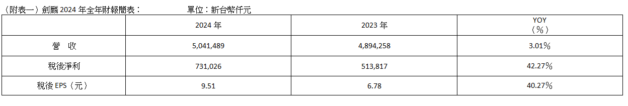 劍麟股份有限公司(2228)於今日公布2024年全年合併營收達新台幣50.41億元,年增3%,受惠旗下汽車事業營運表現保持穩定成長,加上2024年第一季認列子公司盈餘轉增資產生之遞延所得稅回轉利益1.27億元以及 2024 年第四季大陸原展示架廠區徵收處分利益稅後 1.1 億元,挹注2024年全年稅後淨利達7.31億元、每股稅後盈餘(EPS)達9.51元,皆分別年增42%、40%水準,創造全年獲利改寫近五年新高之亮眼佳績。