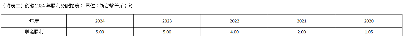 劍麟今日經董事會決議通過2024年盈餘分配,考量公司營運資金充沛與財務體質健全,2024年擬配發每股5元現金股利,以期將經營成果與全體股東共享,以2月27日收盤價99.9元計算,現金殖利率達5.01%。