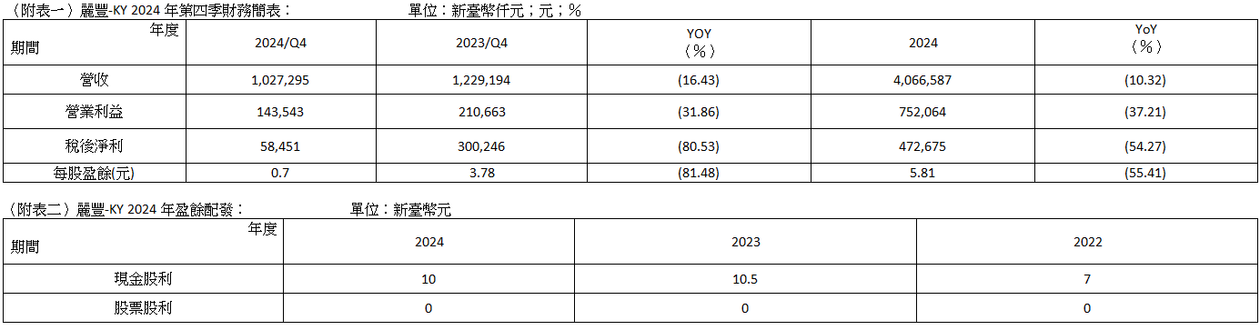 麗豐股份有限公司〈4137〉於今日(2/27)召開董事會,並提報通過2024年全年營運成果。麗豐2024年全年合併營收為新台幣40.67億元,營業利益7.52億元,歸屬於母公司稅後淨利為4.73億元,稅後每股盈餘(EPS)5.81元。麗豐表示,儘管受到主營市場景氣低迷與消費緊縮的影響,導致營運略有下滑,但公司在財務上仍保持穩健的表現,擁有充足的資金支持其各項業務發展,於今日的董事會決議通過2024年每股擬配發10元現金股利(盈餘7元以及資本公積3元)以確保穩健的股利政策,以2月27日的收盤價124元計算,現金殖利率約為8.06%。麗豐-KY目前資金充裕、財務結構穩健,將更積極推動公司旗下各品牌發展和通路優化,以保持穩定的盈利能力,並與股東共享企業成長的成果。