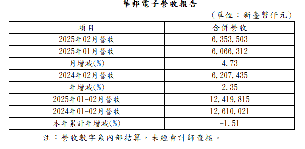 華邦電子(2344)股份有限公司今日公佈自行結算的2025年02月份營收報告。華邦含新唐科技等子公司,02月份合併營收為新臺幣63.54億元,較上個月增加4.73%,較去年同期增加2.35%。累計2025年01至02月合併營收為新台幣124.2億元,較去年同期減少1.51%。