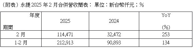 永捷表示,受惠於製鞋產業、紡織產業、環保水性產品等的穩健需求成長,帶動公司整體營運表現持續向上,特別是在全球運動品牌積極推動賽事與市場行銷活動的帶動下,包括Nike宣布2025年After Dark Tour女性賽事系列,進一步提升終端市場對於高性能鞋材等的需求,有助於公司應用在運動相關產品的鞋子、機能衣等出貨動能提升。同時,永捷積極整合子公司信立與普大資源,發揮協同效應,強化研發與生產能力,在環保水性PU樹脂及高固含量水性溶劑等領域的應用深化布局,順應全球市場對永續材料的需求趨勢,透過技術創新與產能擴張,帶動永捷2月營收呈現穩步增長。