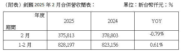 劍麟股份有限公司(2228)於今日公布2025年2月合併營收為新台幣3.76億元,較去年同期微幅減少0.79%,仍改寫歷年同期次高。累計2025年1至2月合併營收為8.28億元,年增0.61%。
