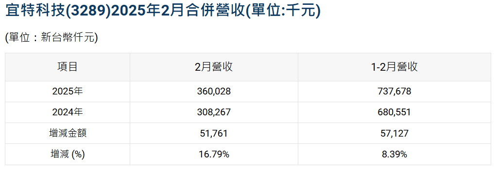 電子產品驗證服務公司宜特科技(3289)公佈2025年2月合併營收約新台幣3.60億元,與去年同期相比增長16.79%。
