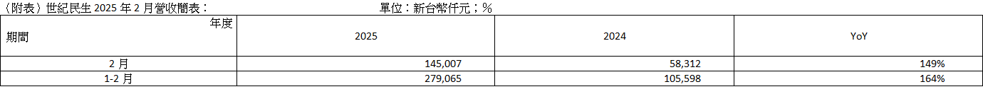 世紀民生科技股份有限公司(5314) 公布2025年2月合併營收達145,007仟元,月增8.17%,年增149%;累計2025年1至2月合併營收達279,065仟元,較去年同期成長164%。受惠於二月天數回歸正常,加上全通路銷售策略的持續深化,公司營收較1月回升,較去年同期亦維持穩健增長。隨著消費市場對於高附加價值健康產品的需求提升,世紀民生透過直播、電商及實體零售的多元布局,展現出強勁的營運成長動能。