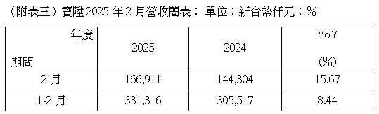 寶陞進一步指出,2025年2月合併營收達1.67億元,除了受惠既有木地板、SPC石塑地板等相關產品銷售表現保持一定水準,加上旗下新系列產品獲得客戶好評,並已於全美開始銷售,皆係挹注2025年2月整體營收表現繳出月增1.52%、年增15.67%,進一步刷新歷年同期新高之亮眼佳績。