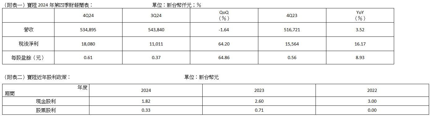 考量公司整體財務體質健全,今日經董事會決議通過2024年盈餘分配,2024年擬配發每股2.15元股利,包括每股1.82元現金股利、每股0.33元股票股利,配發率高達98.17%,依最近一日收盤價格47.2元計算,現金殖利率約3.86%,以期將公司經營成果回饋全體股東共享。