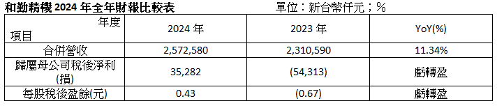 高端精密沖壓大廠和勤精機(1586)公告2024年全年營運成果暨董事會重大決議。