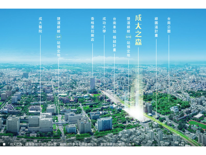 「成大之森」位台南市中心,正對成大25萬坪校園,後擁4萬坪台南公園,緊臨車站TOD再造計畫,繁華自然兼備,值得傳世收藏。