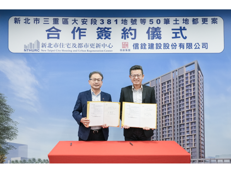 圖說:信創集團總裁黃炳銘(左)、新北住都中心執行長錢奕綱(右)完成簽約, 攜手推動位於三重區中正南路的老屋重建案。